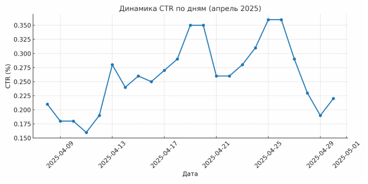 CTR кампании стабильно рос с середины месяца, достигнув пика 25–26 апреля (0,36%). Итоговый средний CTR составил 0,27%, что значительно выше среднеотраслевого значения для сегмента B2B-автотранспорта.