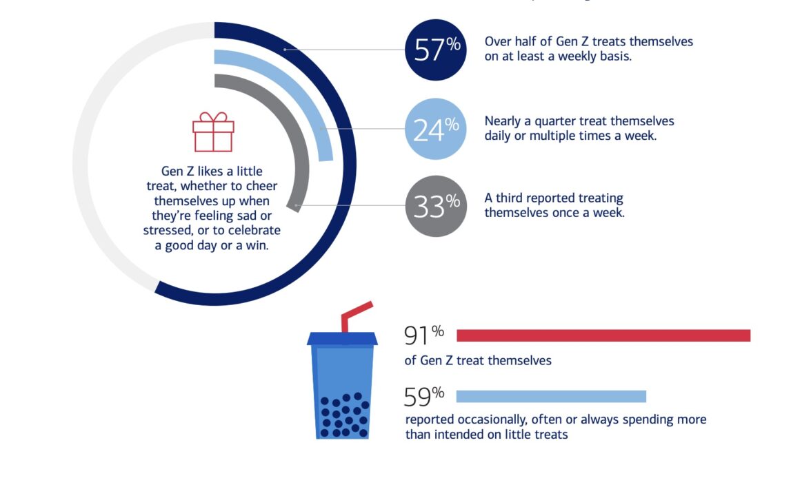 Представители поколения Z любят периодически радовать себя какой-нибудь мелочью. В этом признались 91% опрошенных. При этом большинство (59%) признались также, что привычка себя баловать порой приводит к лишним тратам. Более половины (57%) чем-то балуют себя как минимум раз в неделю. 33% делают это один раз в неделю, 24% — несколько раз в неделю или ежедневно.