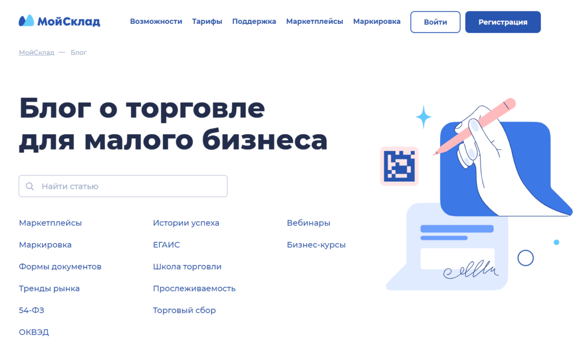 Что полезного. Статьи отвечают на вопросы малого бизнеса: о маркировке товаров, онлайн-кассах и формах документов. Как открыть офлайн-точки и торговать на маркетплейсах. Какие бывают штрафы и ограничения.