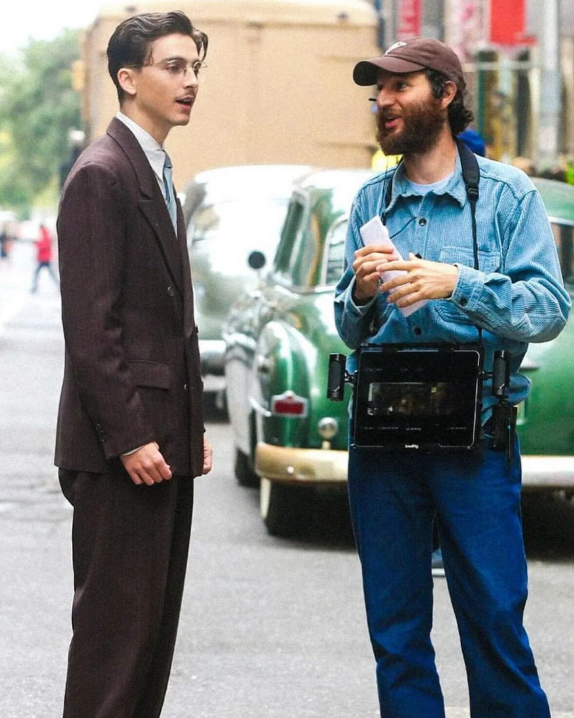 Тимоти Шаламе и Джошем Сэфди на съемочной площадке фильма «Марти Суприм»