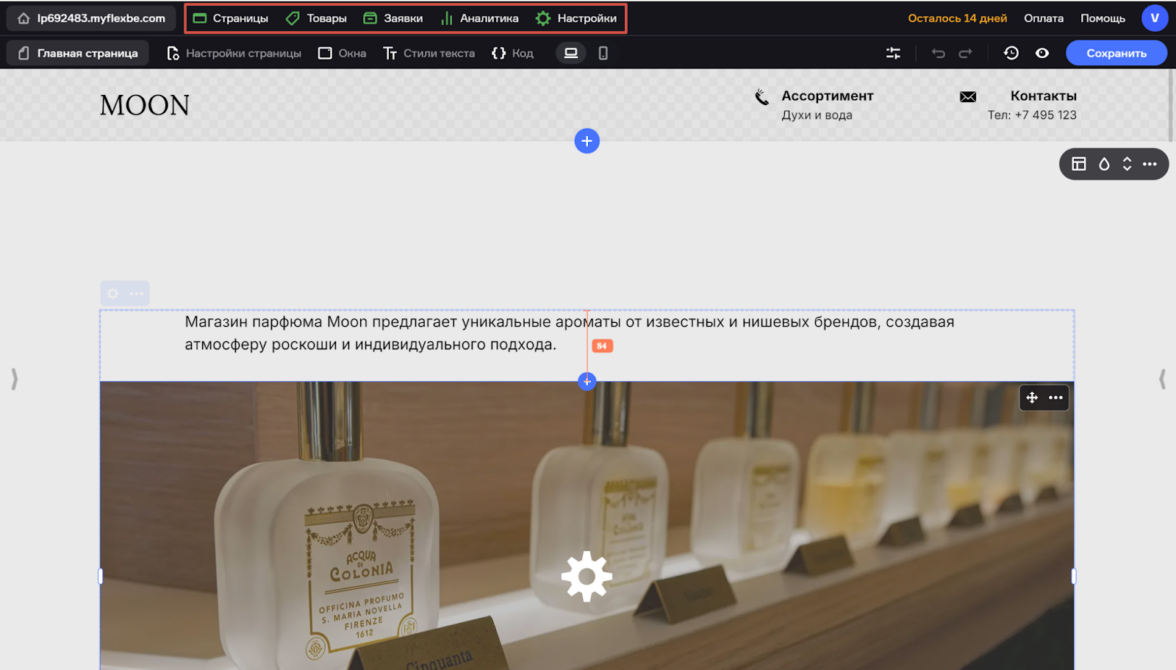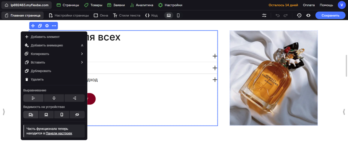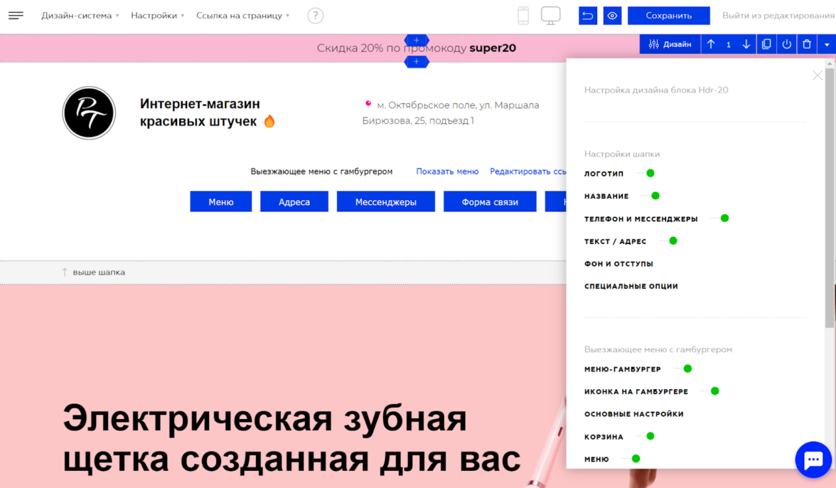 Редактор простой и понятный, позволяет оформлять кнопки, товарные карточки, формы быстрого заказа. Секции на страницах можно перемещать, удалять и добавлять новые, каждую легко отредактировать, нажав на «Дизайн» в меню блока.