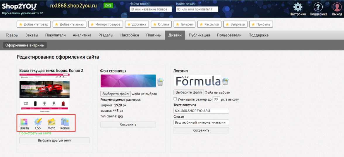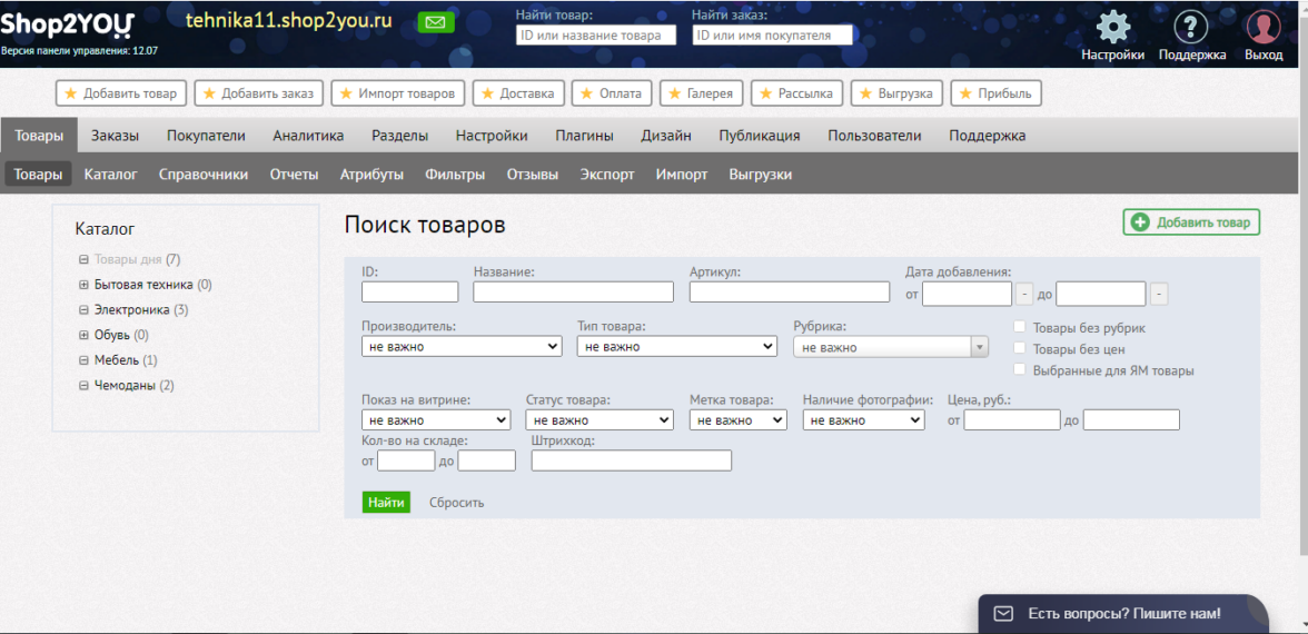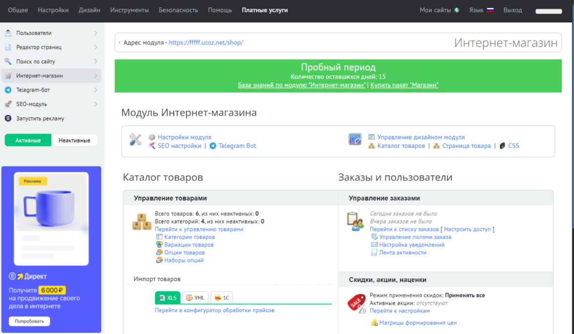 В панели управления можно активировать модуль интернет-магазина и получить нужный набор опций: настройки форм заказа, корзины, оплаты, инструменты для импорта/экспорта с подробной инструкцией. В верхнем меню можно просматривать статистику, настраивать рекламу и рассылку.
