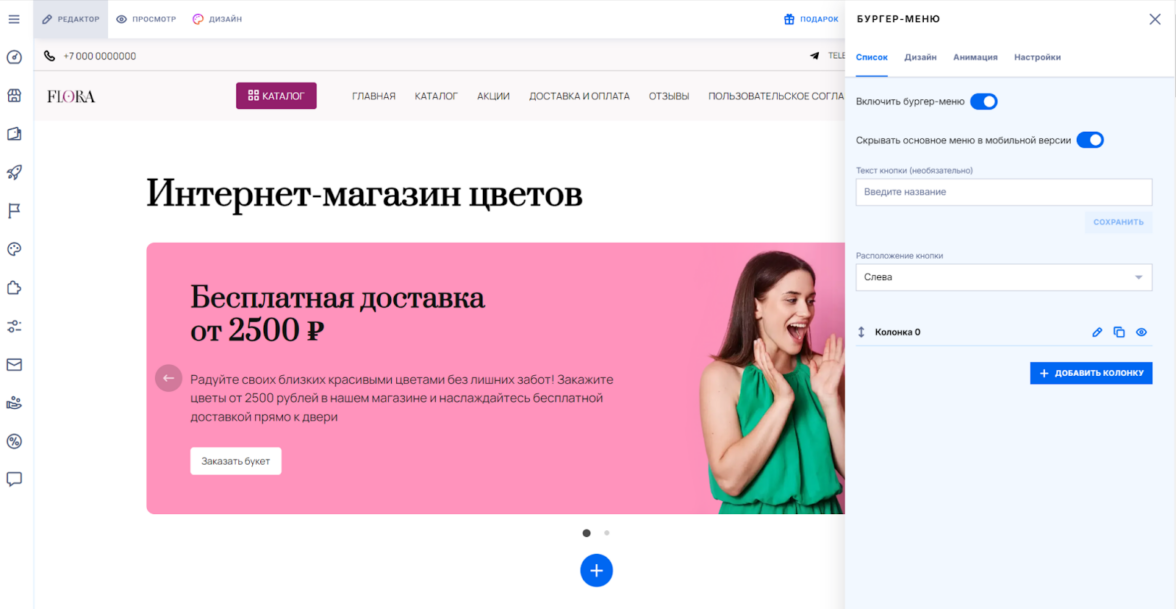 В разделе «Дизайн сайта» можно выбрать шаблон, многие подойдут интернет-магазинам. Каждый блок настраивается в визуальном редакторе — можно менять фон, шрифты, загружать изображения. Секции легко перемещать, скрывать и добавлять новые. Есть бургер-меню для более тонких настроек.