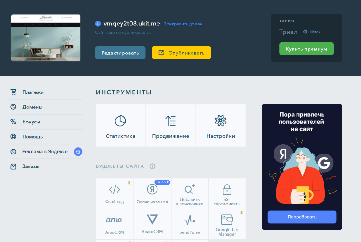 В панели управления много настроек для постраничной сборки сайта. Есть возможность переехать с лендингового конструктора LP: оба сервиса создавали одни и те же разработчики.