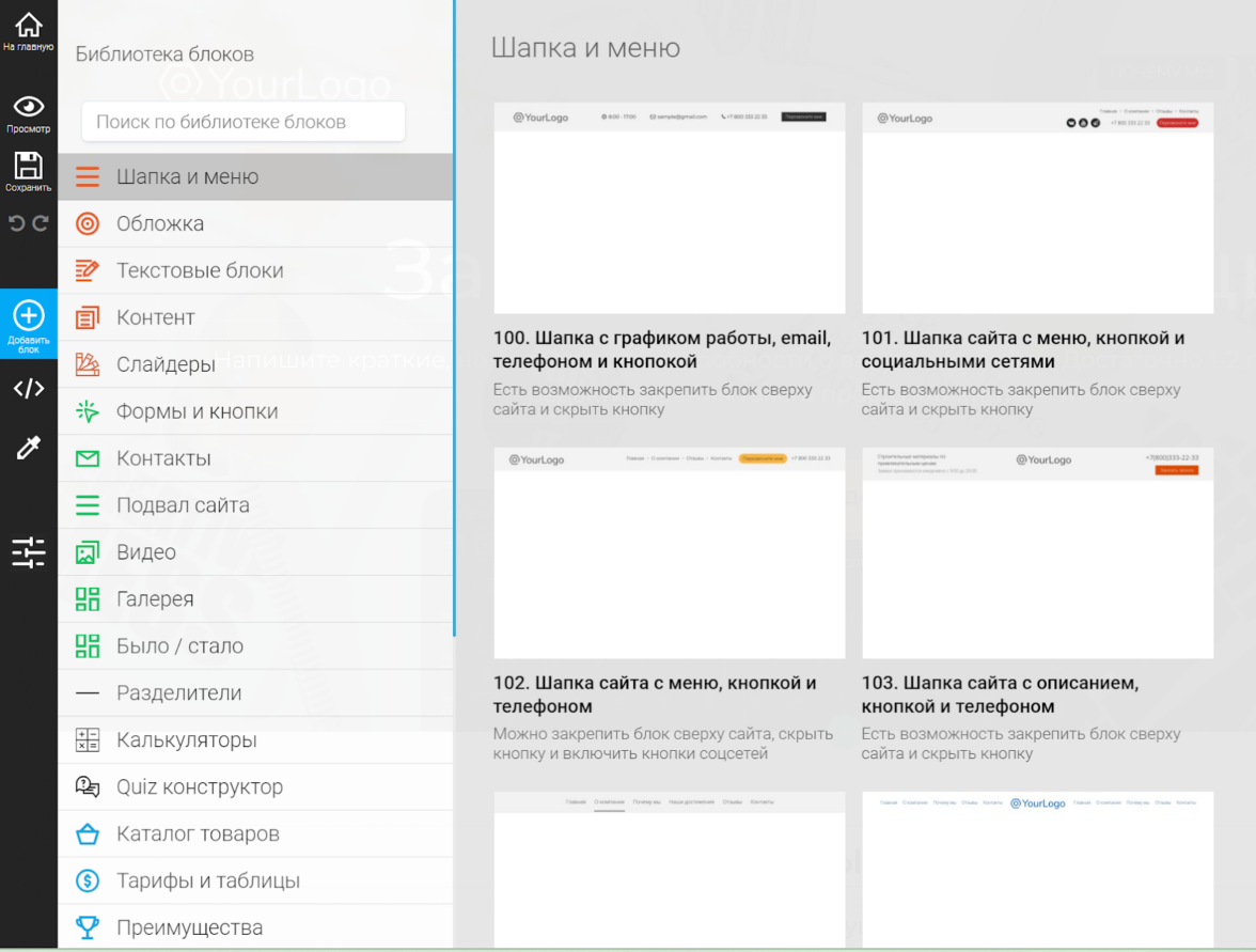 • Хороший выбор готовых блоков.