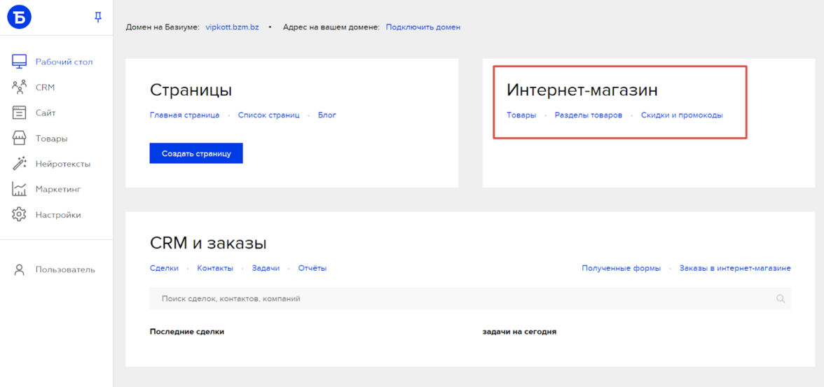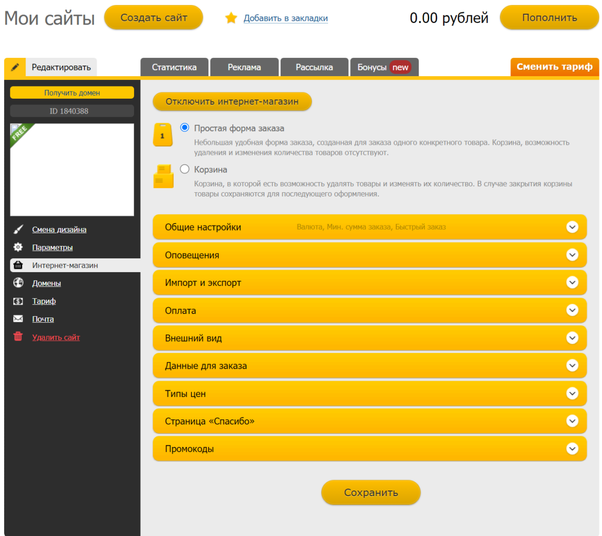 Еще одна хорошая платформа, на которой можно развернуть онлайн-торговлю. После регистрации система предложит выбрать тип проекта, среди которых есть «Магазин». В панели управления основные настройки расположены на рабочем столе, в разделе «Интернет-магазин» добавляют товары и создают акции.