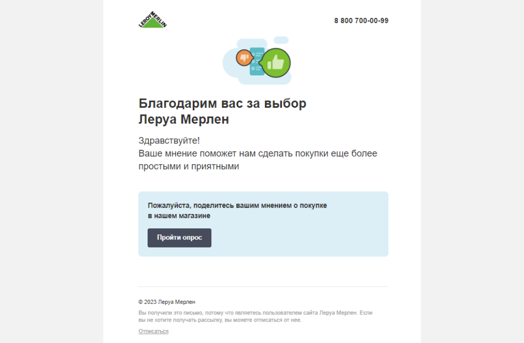 Пример рассылки у Леруа Мерлен для сбора отзывов после покупки