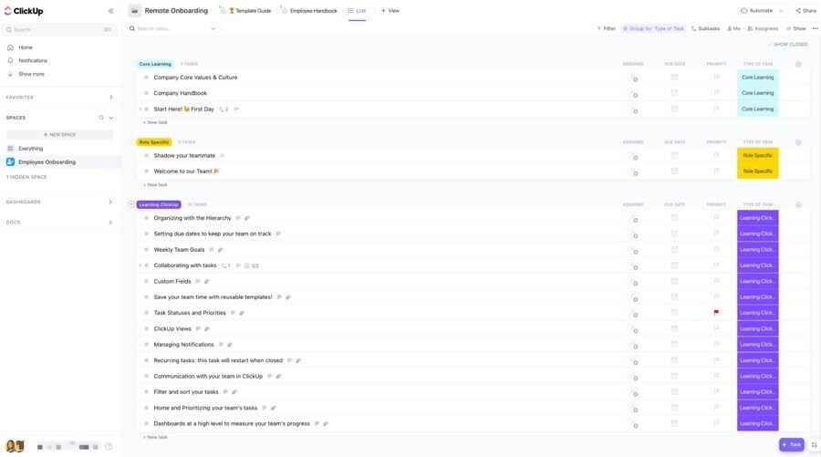 ClickUp позволяет легко создавать задачи адаптации, назначать проекты новому сотруднику и даже создавать настраиваемые статусы, чтобы четко отображать каждую фазу нового найма. Используйте этот готовый к использованию и редактируемый шаблон адаптации удаленных сотрудников.
