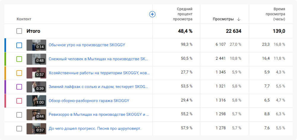 Посмотрите на скриншоте ниже на количество просмотров ролика «Подготовка к сезону…». На видео работа станков и прочие производственные работы, людей практически не видно, основной посыл направлен на работу станков. И вот результат — всего 77 просмотров. А рядом — ролики с живыми объектами. Именно они собрали большое число просмотров практически в первые часы после загрузки.