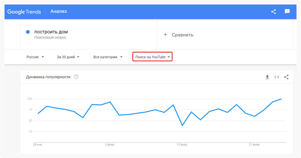 Вбиваем запрос, выбираем желаемый период времени, устанавливаем «Поиск на YouTube», и смотрим результаты.