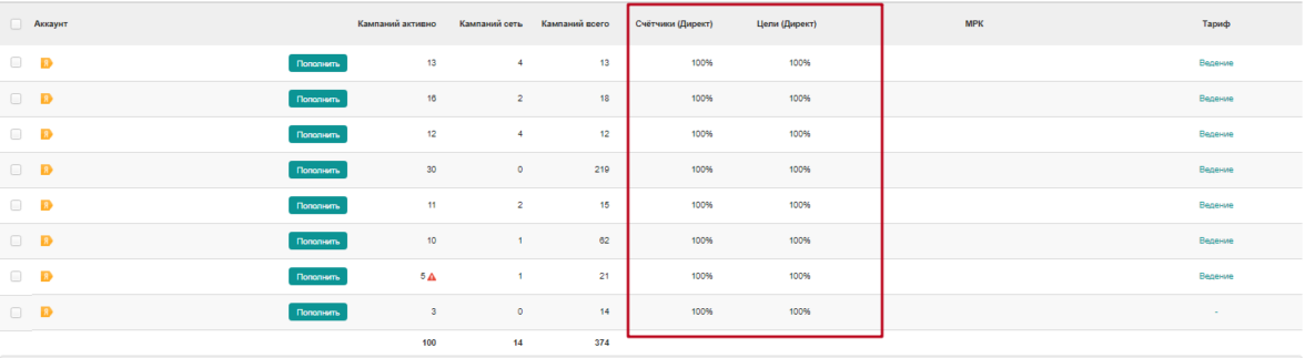 Срез по настройкам счетчиков и целей Метрики в каждой кампании.