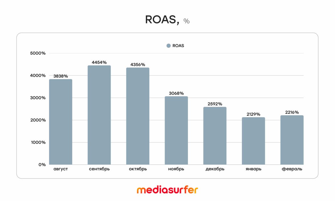 • Средний показатель ROAS за период составил 3 236%, достигнув максимума в сентябре — 4 454%.