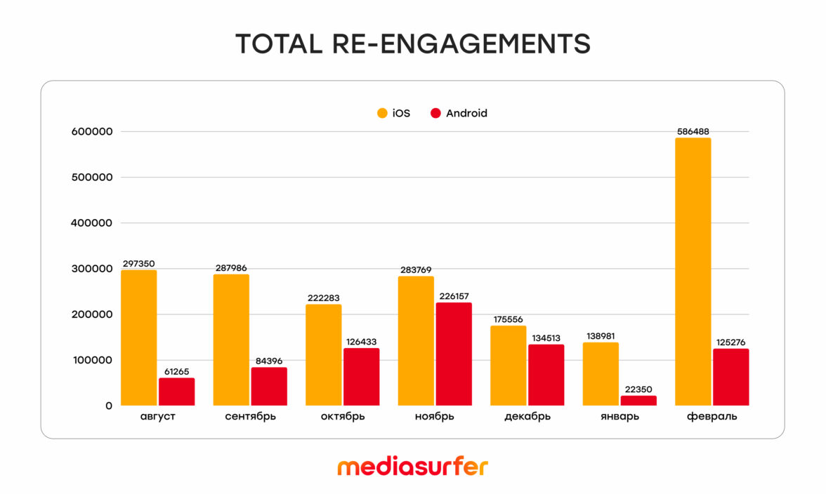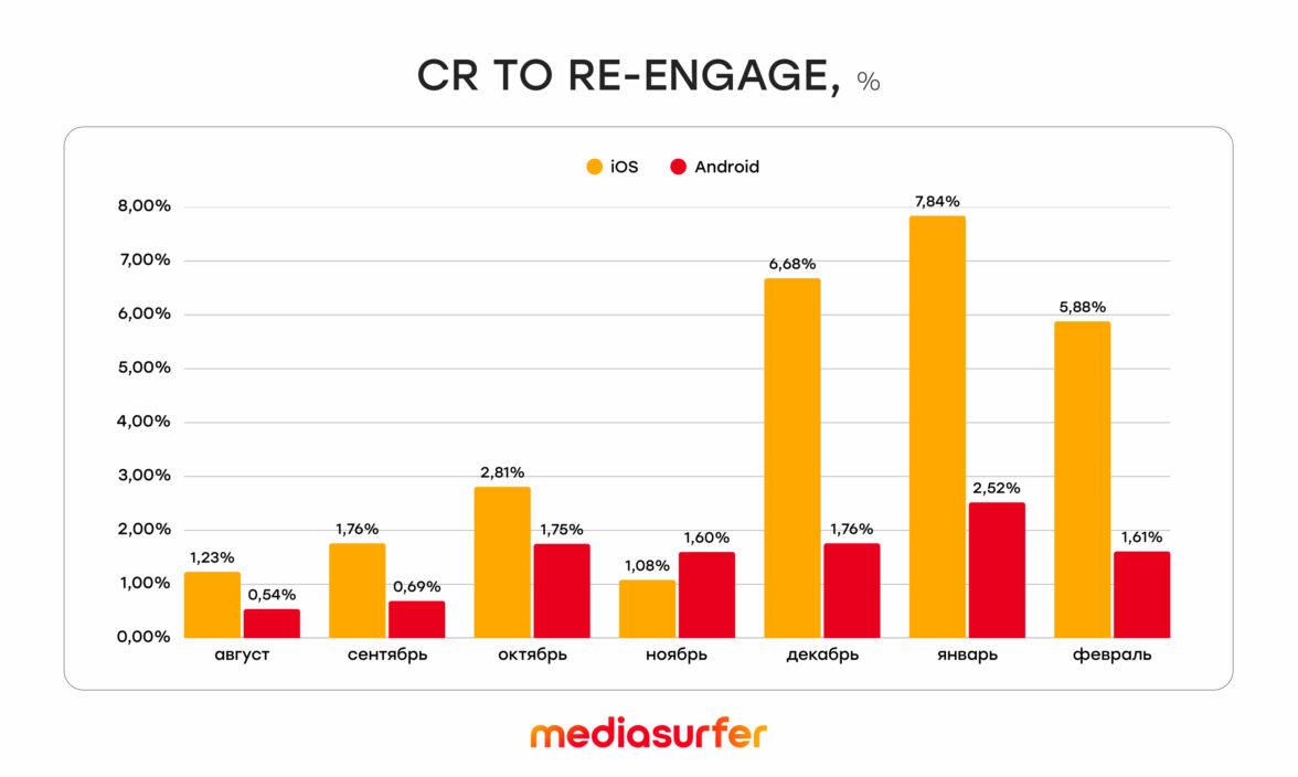 • Конверсия в повторные взаимодействия стабильно росла и достигла максимальных значений в январе: 7,84% на iOS и 2,52% на Android.
