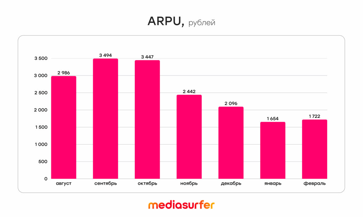 • Средний доход на пользователя (ARPU) за период составил 2 549 рублей, пиковое значение в сентябре — 3 494 рубля.