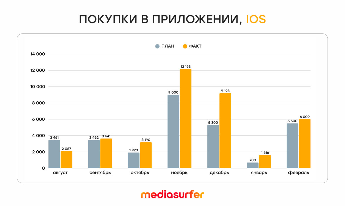 Эти корректировки быстро повлияли на результаты: уже через месяц выполнение плана на iOS составило 165% и продолжило расти, достигнув 230% в декабре.