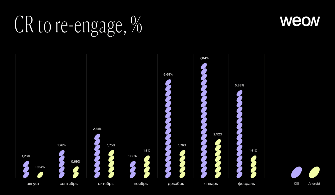 Конверсия в повторные взаимодействия стабильно росла и достигла максимальных значений в январе: 7,84% на iOS и 2,52% на Android.