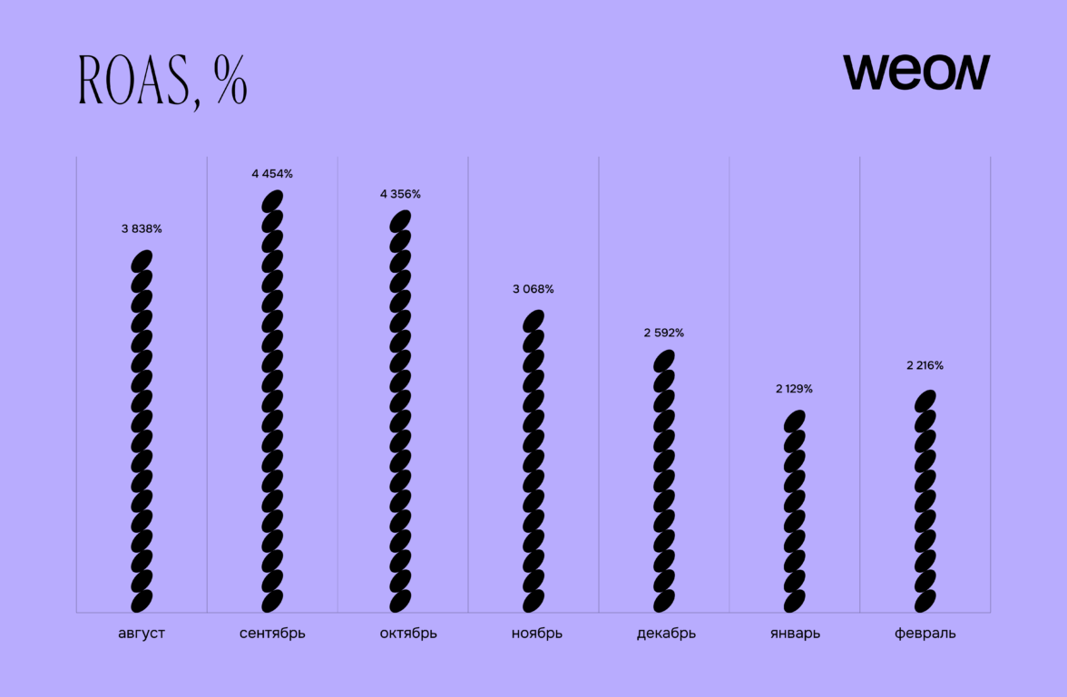 Например, в ноябре (Черная пятница) показатель ROAS составил 3 068%, а в декабре (новогодние продажи) — 2 592%. Это подтверждает устойчивость выбранной стратегии в условиях повышенного спроса и высокой конкуренции.
