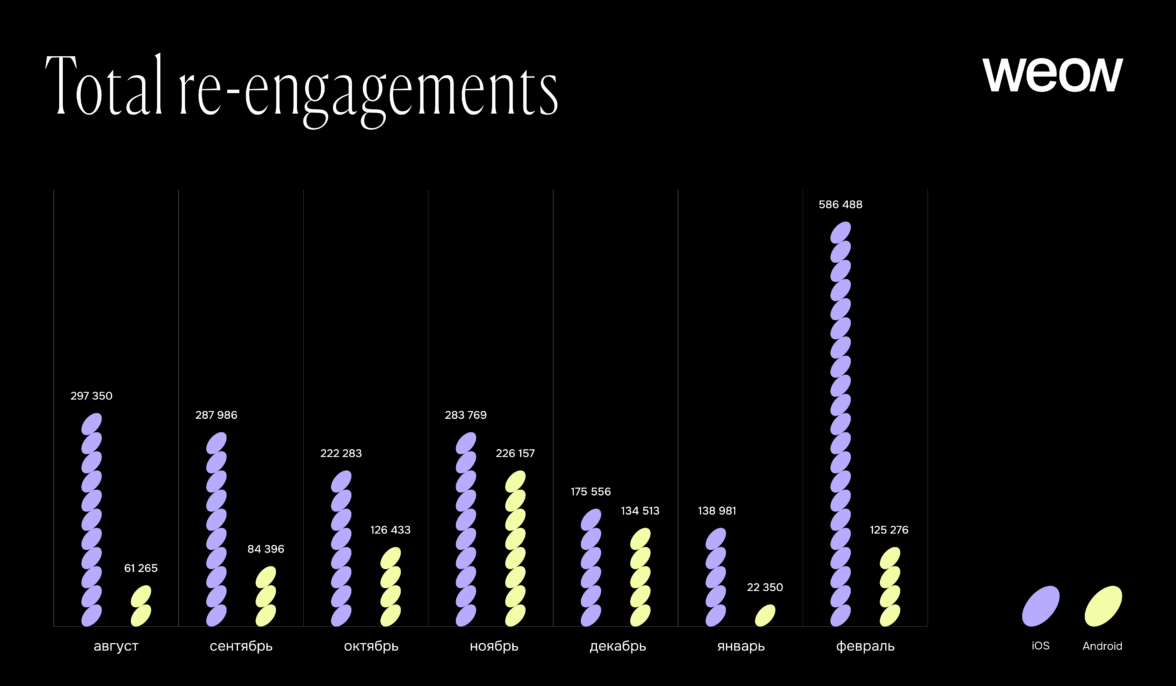 Конверсия в повторные взаимодействия составила 1,23% на iOS и 0,54% на Android.