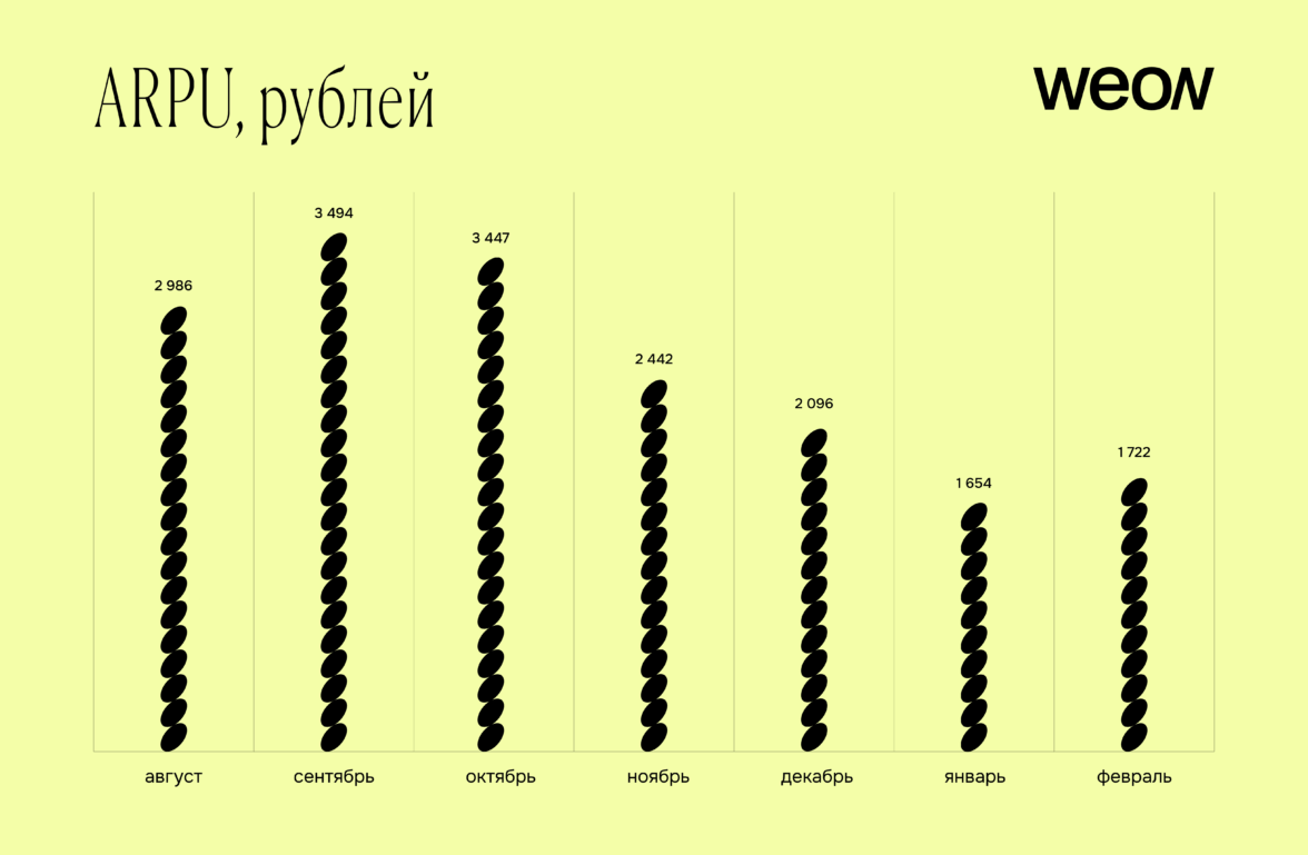 Средний доход на пользователя (ARPU) за период составил 2 549 рублей, пиковое значение в сентябре — 3 494 рубля.