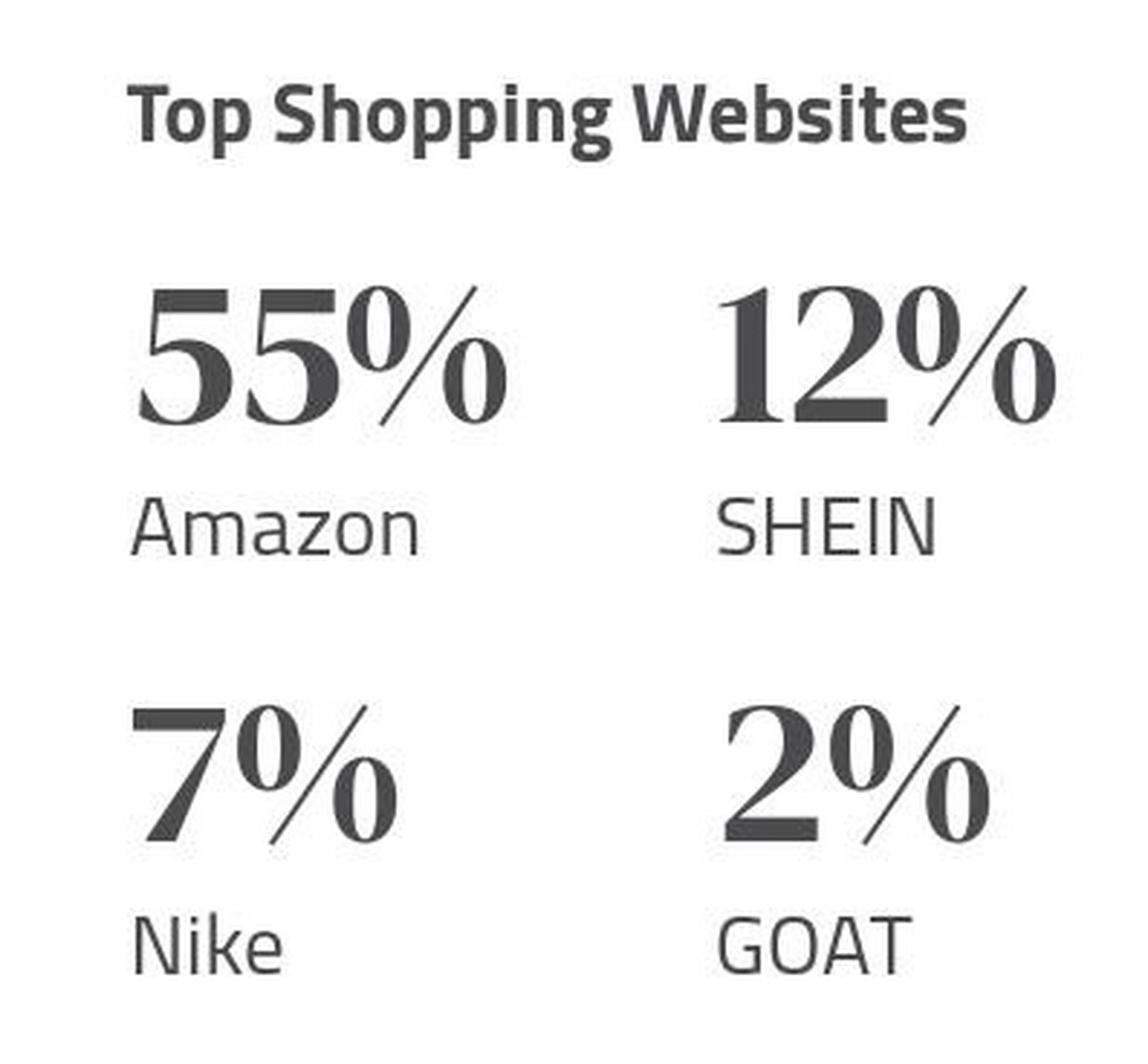 Главной ритейл-площадкой американских подростков, как и всей Америки, остается Amazon. Здесь одежду покупают 55% респондентов. 12% участников исследования одеваются в SHEIN. 7% — приобретают любимые кроссовки и одежду напрямую у Nike. 2% — используют онлайн-платформу GOAT.