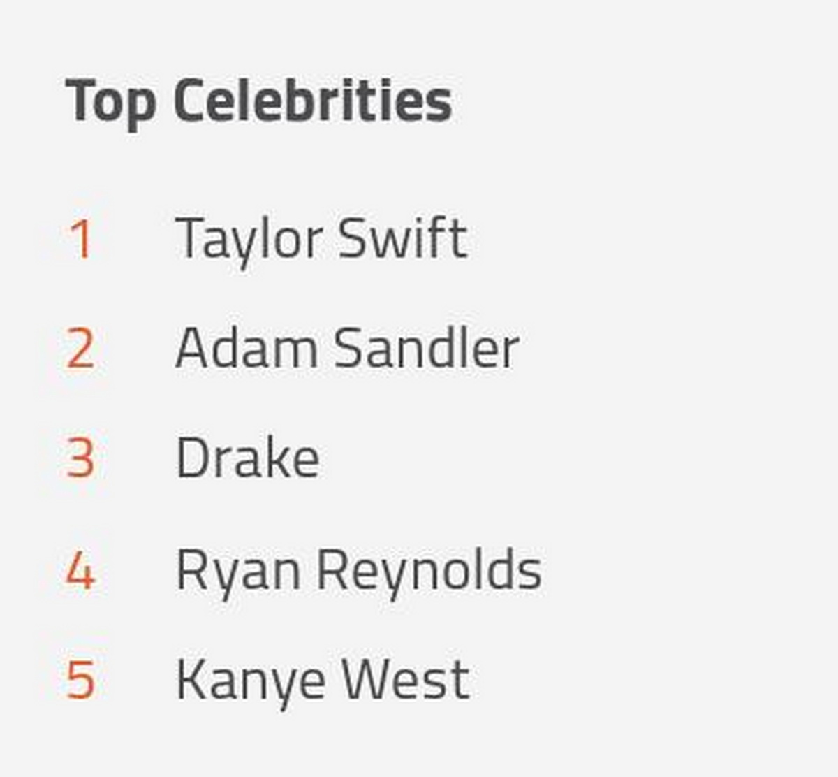 Здесь исследователи обошлись без процентов, а просто представили хит-парад знаменитостей. Лидирует певица Тейлор Свифт, за ней идет комик Адам Сэндлер, а замыкает топ-три канадский рэпер Дрейк.