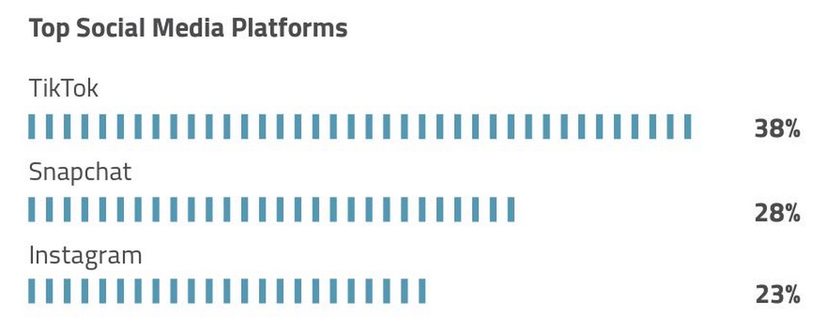 Похоже, что больше всего видео участники опроса смотрят в китайской соцсети TikTok. Это любимое соцмедиа 38% респондентов. На втором месте Snapchat – 28%. Третье у Instagram* — 23%.