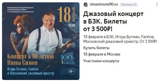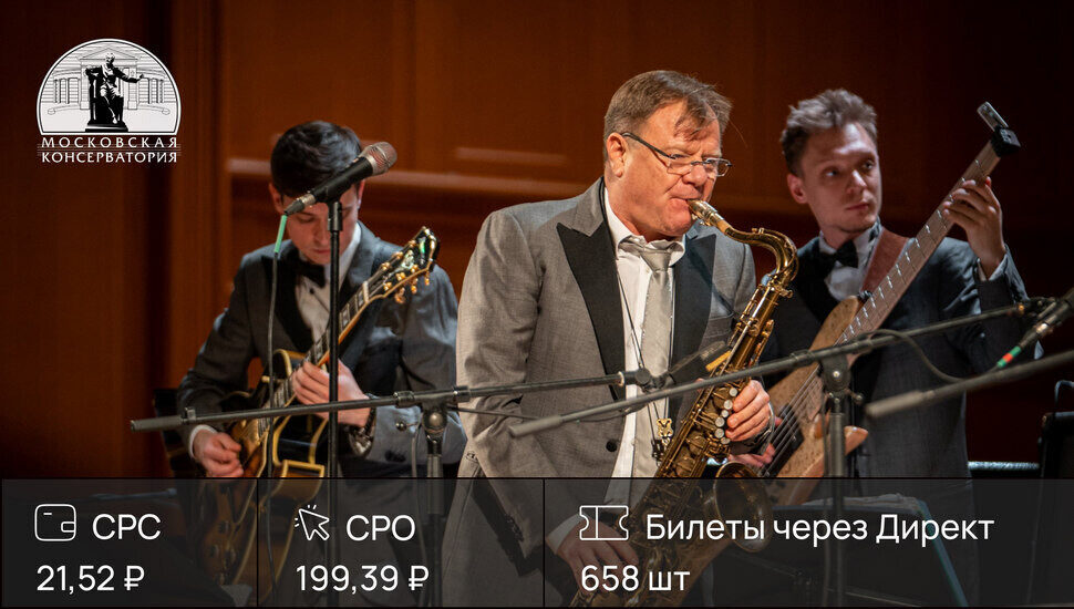 Заполненный зал Консерватории — приятный итог, но нужно понимать, что продажа билетов на концерт — это все-таки мультиканальная история. Использование только контекстной рекламы будет не так эффективно.