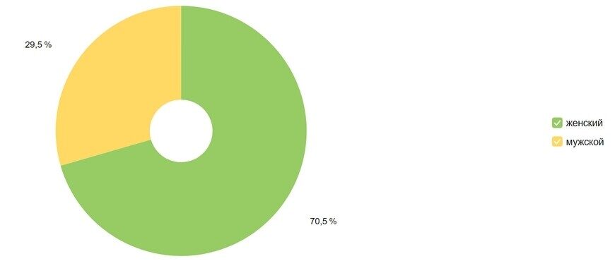 2. Билеты чаще покупают женщины, и такая динамика свойственна не только для этого концерта. В нашем же случае распределение по полу следующее: 70,5% женщины, 29,5% мужчины.
