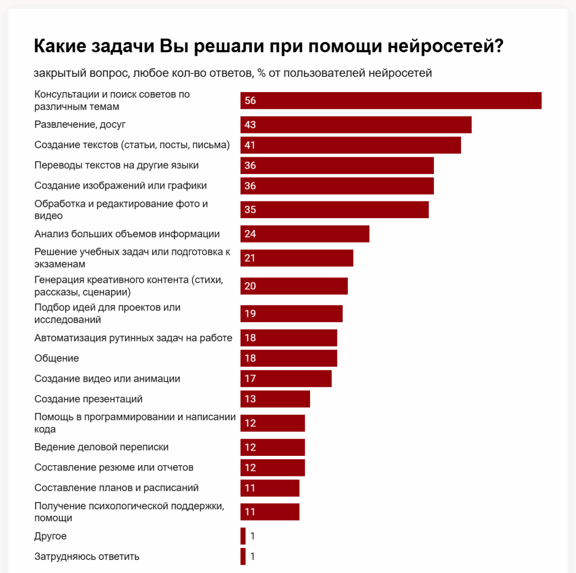 По данным ноябрьского опроса ВЦИОМ, наиболее распространенным сценарием применения нейросетей остаются консультации и поиск советов по различным темам — так ответили 56% пользователей ИИ. На втором месте — развлечения и досуг (43%), а также создание текстов — статей, постов и писем (41%).