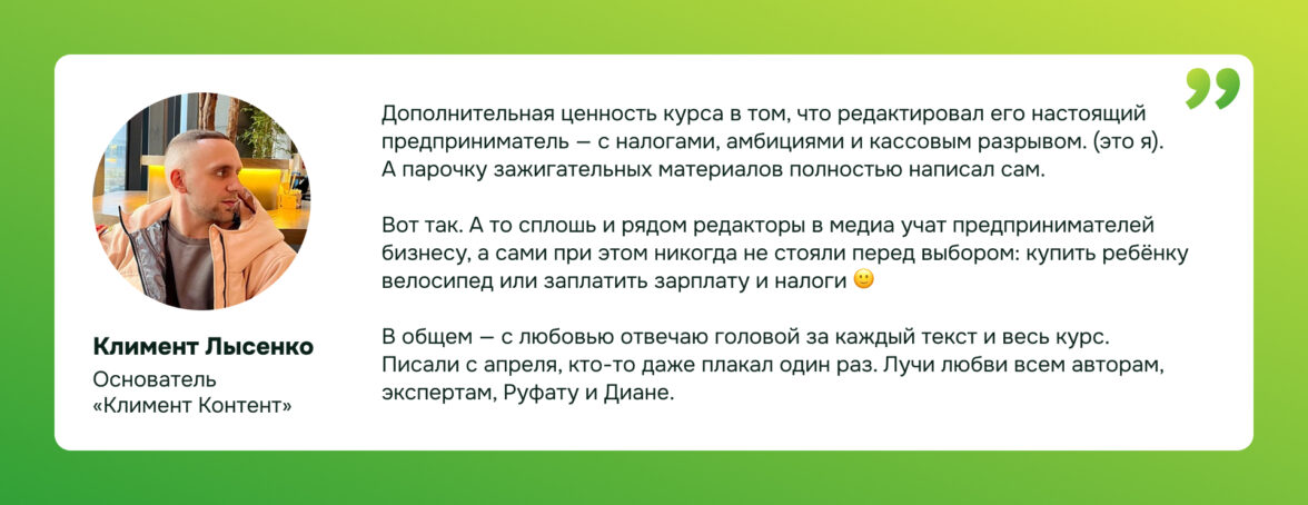 «Делал большой спецпроект с Климентом и его ребятами — отличное агентство. Пишут классные, живые статьи, придумывают смешной, цепляющий визуал. Сроки не продалбывают, а если что-то идёт не так — предупреждают и предлагают вариант решения. Всегда идут навстречу и горят проектом. В общем, получил полноценный кайф от сотрудничества с Климентом».