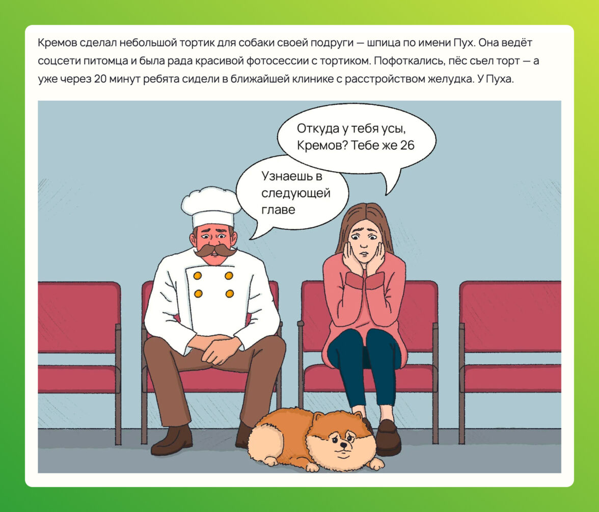 Кремов — не просто иллюстрация к теории. Он ошибается, сомневается, учится на своих косяках. Когда читатель видит, как Кремов чуть не открыл кондитерскую в бизнес-центре, где люди хотят борщ, а не эклеры — это запоминается лучше любого списка «10 ошибок начинающего предпринимателя».
