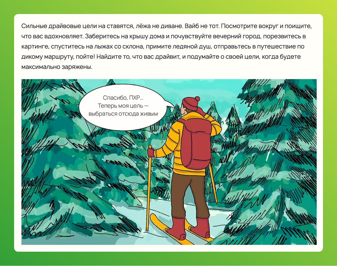 А иногда просто развлекали читателя юмором с помощью картинок. Например, в статье «Как ставить цели в бизнесе, чтобы легко достигать выдающихся результатов»: