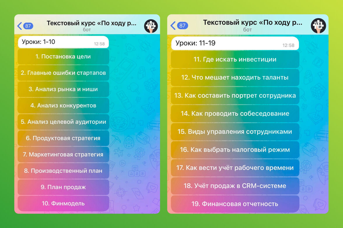 Курс должен был продаваться через телеграм-бота. Наша задача — написать весь контент: 19 больших статей, каждая с экспертом, примерами и иллюстрациями.