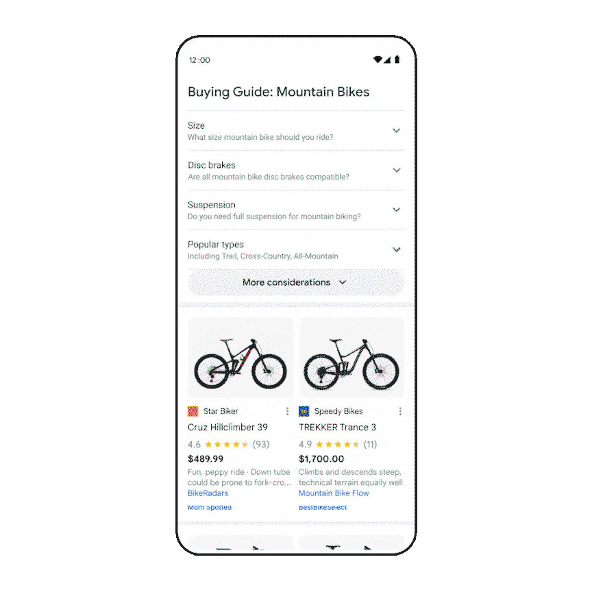 Еще два нововведения коснутся только американских покупателей. Некоторое время назад им было предложено «Руководство по покупке» от Google. Это руководство собрано, по уверениям Google, из надежных источников и отображает дополнительную информацию о товаре в раскрывающемся меню. Google использует в качестве примера горный велосипед, показывая, что в «Руководстве по покупке» есть информация о его размерах, весе, подвеске и материалах, из которых он изготовлен. Нововведение избавит от поиска такой информации на других ресурсах. Также у американских покупателей появится еще одна функция — «Page Insights», на которой будут собраны плюсы и минусы товара и его рейтинг. Здесь же можно будет следить за изменением его цены. Запуск этих обновлений запланирован на конец года.