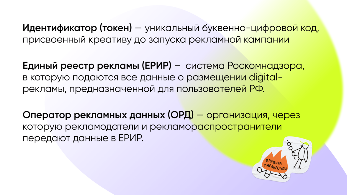 Перед запуском рекламных кампаний маркировать рекламу. Для этого нужно отправлять данные в ЕРИР через ОРД. Внутри должна быть информация о рекламодателе, креативе и тексте. После — получаем токен на каждое рекламное объявление.