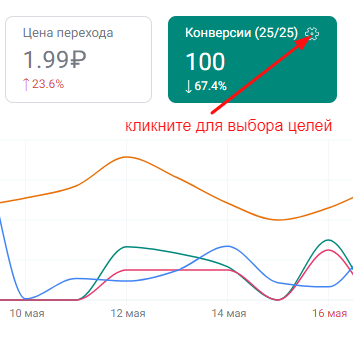 Для проектов, которые подключили к системе счетчики веб-аналитики (Яндекс Метрику или Google Аналитику), есть возможность отслеживать показатели конверсий по любым наборам целей. Можно выбрать несколько равнозначных с точки зрения продаж целевых действий (например, регистрация на вебинар и запись на видеокурс).