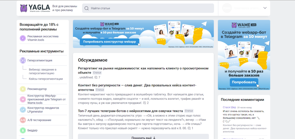 Yagla — сервис, который специализируется на сегментации в рекламе. У платформы есть отдельный сайт для ведения блога о маркетинге, рекламе и управлении проектами в digital-среде. Он подходит тем, кто хочет рассказать о своем опыте, поделиться инструкциями и мыслями по развитию агентского бизнеса.