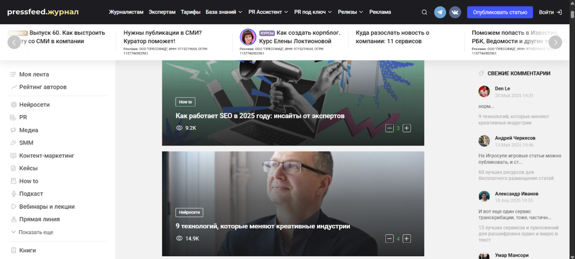 Pressfeed.Журнал — это блог на базе одноименного сервиса для связи пиарщиков и журналистов. Здесь выходят статьи о коммуникациях, маркетинге, развитии медиа и контенте. Если у вас есть сильный кейс, гайд или чек-лист — эта платформа вам подойдет.