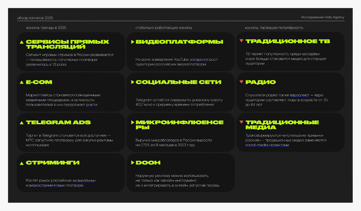 После определения своей аудитории, пора выбирать подходящие каналы для ее привлечения. Что сейчас в топе и какие цифры?
