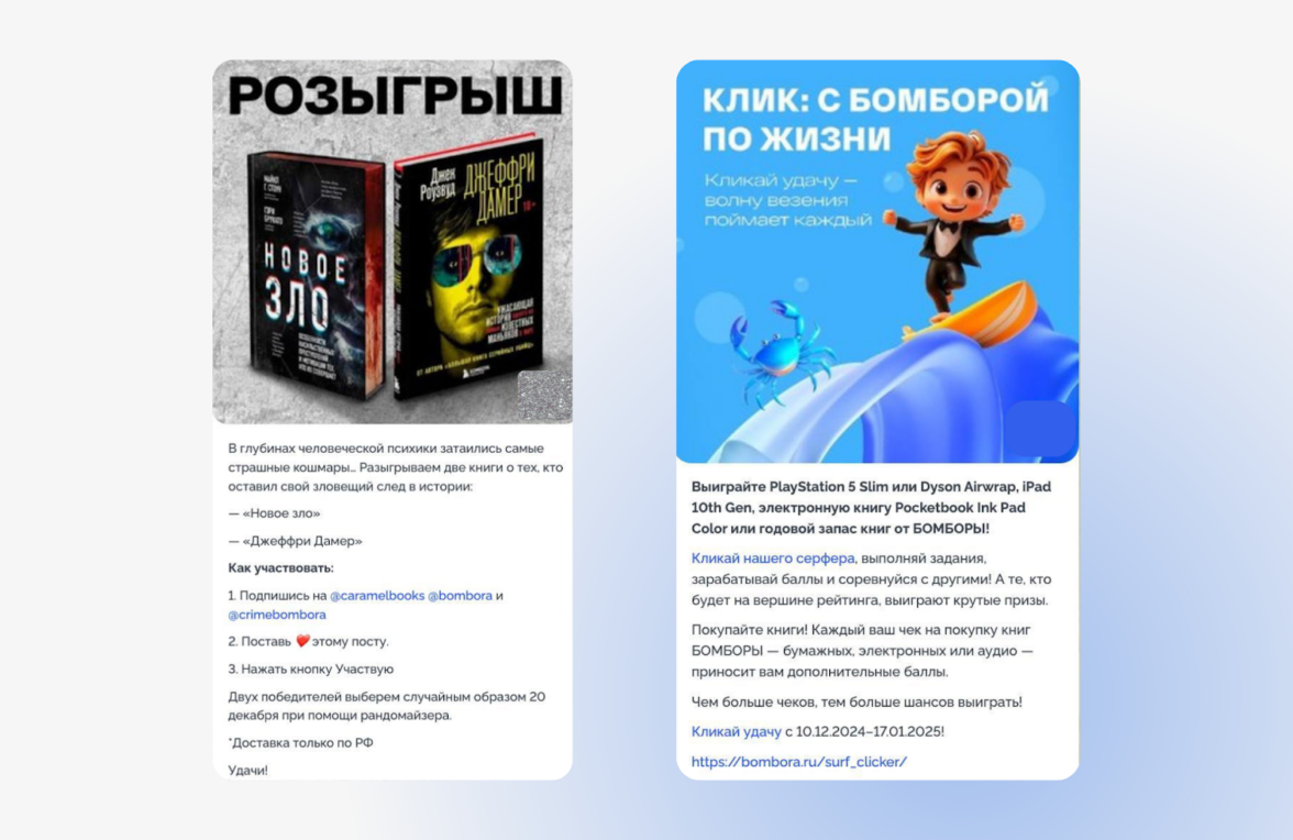Мы активно используем нативную рекламу как ключевой инструмент продвижения издательства. В зависимости от целей выбираем одну из трёх стратегий: продвижение отдельных книг, официального Telegram-канала или бренда «БОМБОРА» в целом.В продвижении книг мы делаем ставку на телеграм-каналы, целевая аудитория которых максимально совпадает с тематикой книги. Например, биографию Бритни Спирс мы продвигали через фанатские каналы Бритни. Секрет эффективности: максимально точно попасть в предпочтения аудитории. Для продвижения бренда через нативную рекламу мы выбираем литературные каналы с качественным контентом, уделяя внимание активности подписчиков — наличию комментариев, реакций и естественного взаимодействия с постами.Привлекать новую аудиторию в канал издательства нам помогают розыгрыши, которые мы активно продвигаем в книжных каналах. Именно в этом сегменте посевы через платформу Telega.in в 2024 году занимают около 80% маркетинг-микса. По сравнению с прошлым годом их доля кратно выросла благодаря эффективности нативных кампаний.