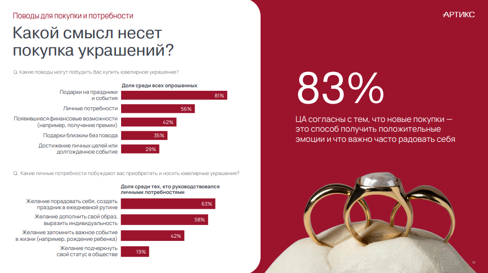 Большинство потребителей покупают украшения в подарок на праздник (81% опрошенных), второй по частоте повод — личные потребности, среди которых наиболее частые — желание порадовать себя и получить положительные эмоции (63%) и подобрать украшения для образа (58%).