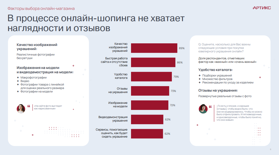 Главный барьер в процессе онлайн-шопинга — недостаточно отзывов и наглядности товаров — 89% респондентов отмечают качество изображений украшений на сайте как один из ключевых факторов при совершении онлайн-покупки; 73% отмечают наличие реальных отзывов на сайте.