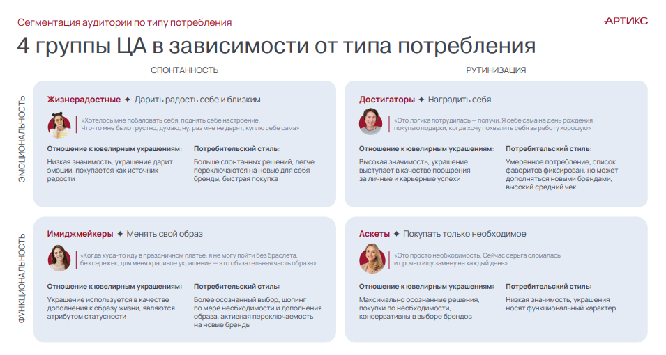 В ходе опроса выделили 4 группы ЦА в зависимости от типа потребления (степень влияния эмоций на покупку, уровень спонтанности):