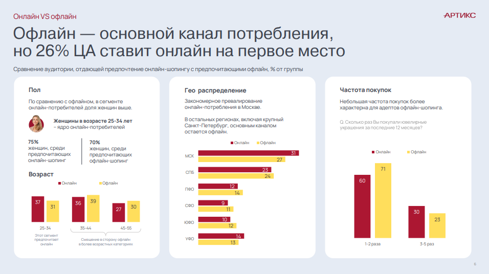 Большая доля среди опрошенных (74%) склонна покупать украшения в офлайне, однако есть группы ЦА, которые предпочитают онлайн-формат — ядро такой аудитории составляют женщины 25–34 лет. Женщины в целом более склонны к онлайн-шопингу: среди покупающих только онлайн их доля выше, чем среди покупающих только в физических магазинах. Покупки в интернете наиболее характерны для жителей крупных городов: среди покупающих онлайн москвичей на 4 п. п. больше, чем среди покупающих офлайн.