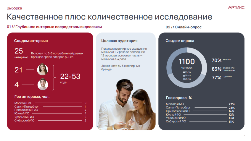 Исследование состояло из двух этапов. На первом было проведено 25 глубинных интервью с использованием проективных методик. В опросе участвовали потребители, кто покупал ювелирные украшения минимум 1–2 раза за последние 12 месяцев и знает минимум 3 ювелирных бренда. В ходе интервью был сформулирован ряд гипотез о поведении и мотивации целевой аудитории, которые команда агентства использовала для составления вопросов для следующего этапа. На втором этапе был запущен количественный опрос на 1100 человек для статистической проверки полученных гипотез.