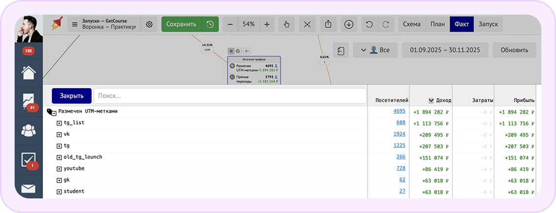 После подключения GetCourse Ads мы стали видеть не только рекламный, но и органический трафик — все цифры в одной воронке. Это дало нам более глубокое понимание эффективности контент-маркетинга.GetCourse Ads автоматически собирает данные и показывает: