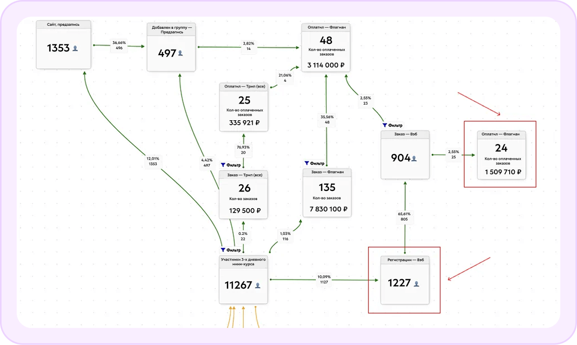 В результате работы с участниками трёхдневного курса в рамках дожимной цепочки внутри окна продаж через e-mail и бот-рассылку было получено 48 оплат флагмана на сумму 3 114 000 рублей и 24 оплаты трипваера на сумму 120 800 рублей.
