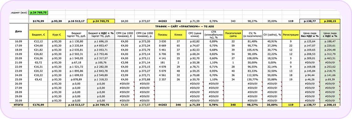 Так выглядел наш отчёт в Telegram Ads, где мы ежедневно отслеживали все показатели и оптимизировали рекламу, чтобы получать заявки в рамках плановых значений.