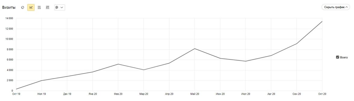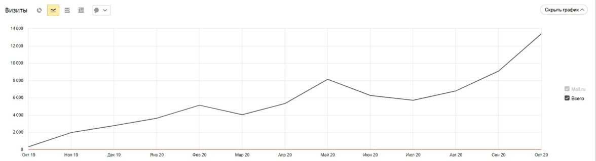 С 6 651 визитов в первый месяц (октябрь 2019) до 16 868 (октябрь 2020). На графике указана совокупность всех источников посещений, включая сайт, поисковую систему, рекомендательную систему.