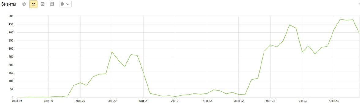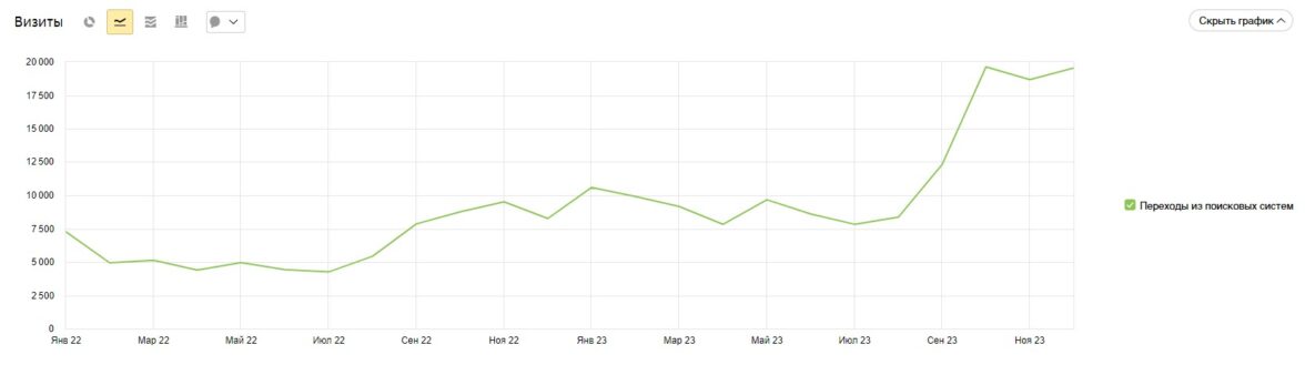 Вопреки всем обстоятельствам, включая спонтанный старт на Дзене, COVID-19 и временное отсутствие спроса на тематику, нам удалось прирасти на 414% по визитам через поисковые системы только за первый год и эта цифра продолжает расти, пока мы пишем этот кейс.